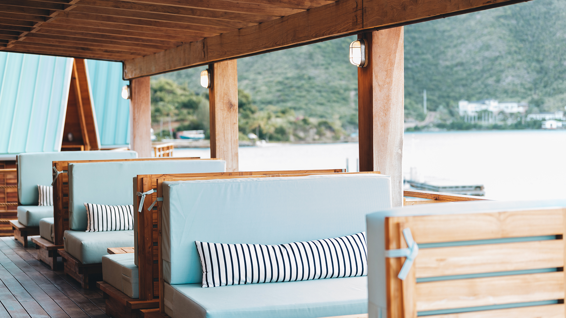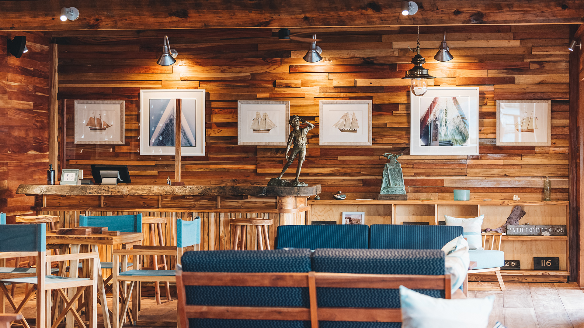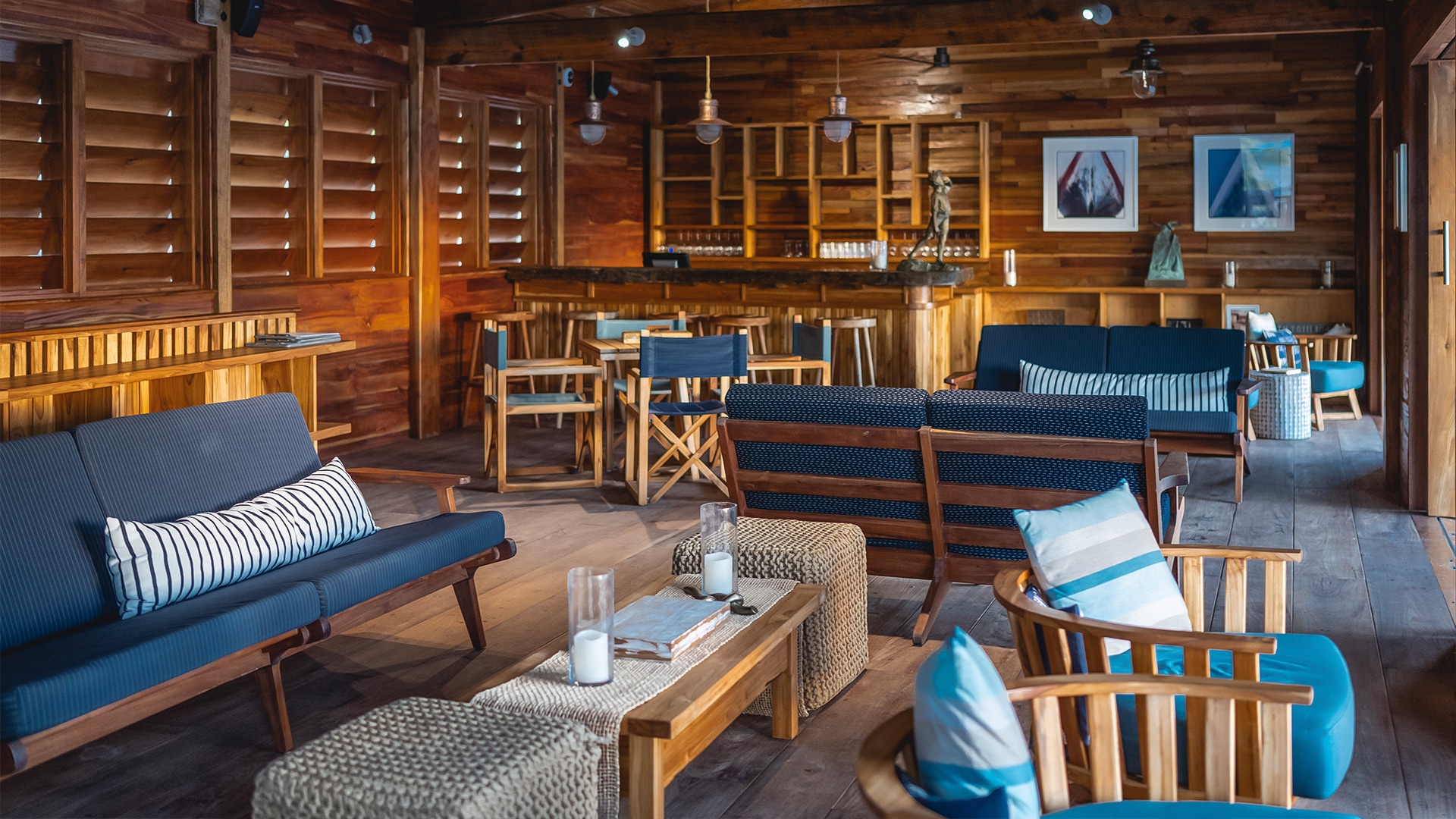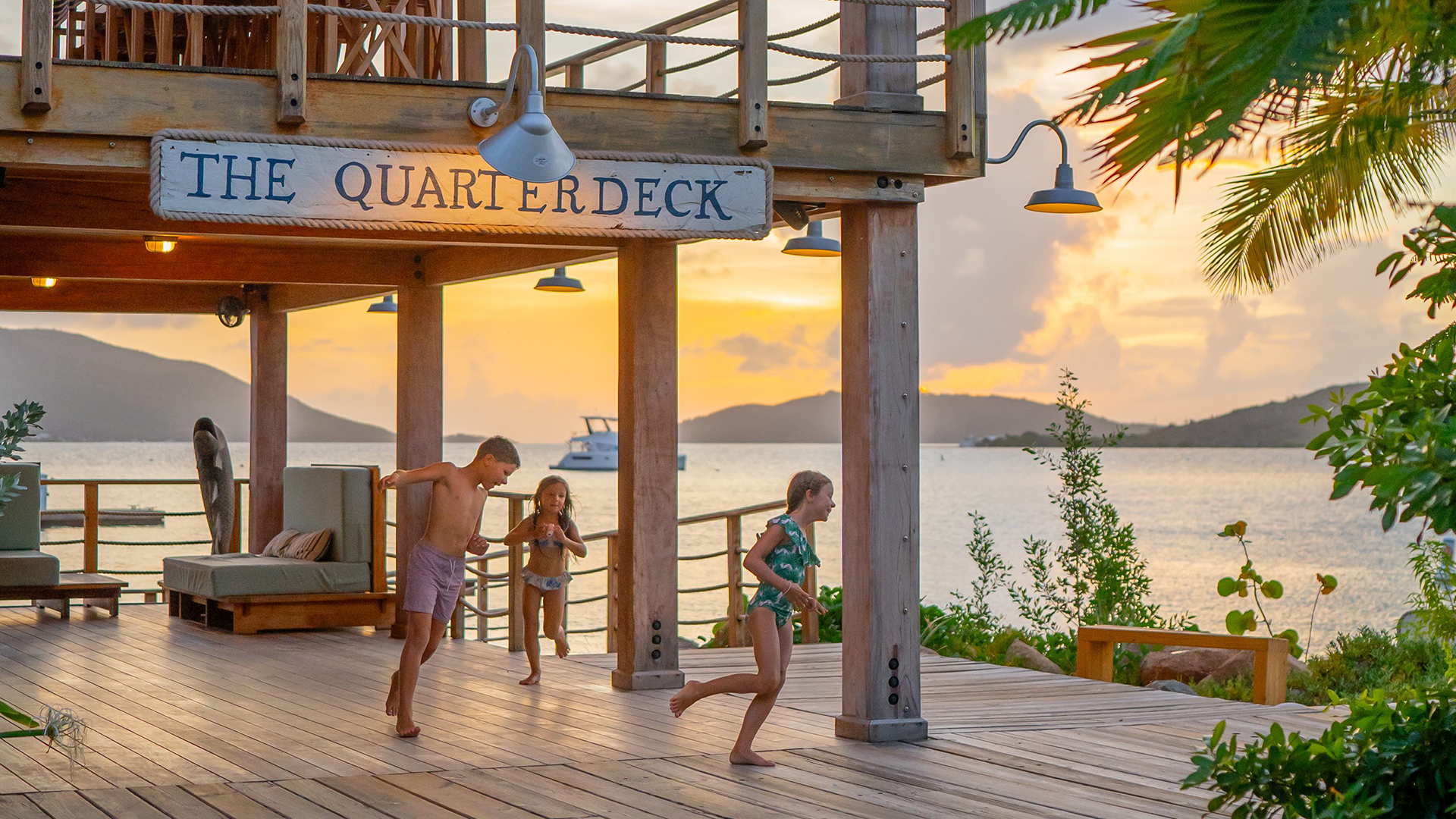 Perched above the docks with panoramic views of the anchorage, The Quarterdeck Lounge & Library is Bitter End’s most refined hideaway. By day, it’s a breezy retreat lined with nautical reads, artifacts, and board games, a quiet place to unwind from island hopping, catch up on a book, or watch the comings and goings of the North Sound.